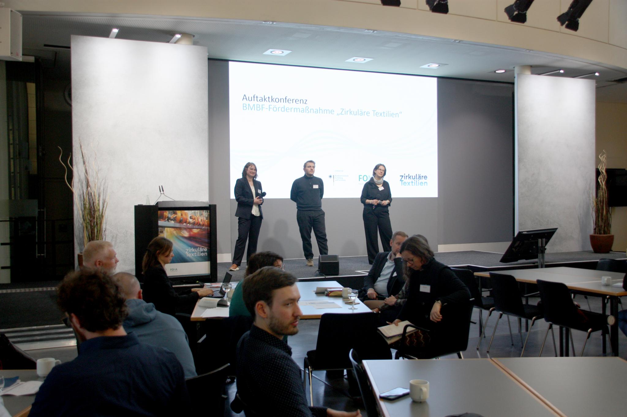 Mit der Auftaktkonferenz im Umweltforum Berlin startete am 11. und 12. März 2025 die neue Fördermaßnahme „Zirkuläre Textilien“ des Bundesministeriums für Bildung und Forschung (BMBF), in der insgesamt 16 Verbundprojekte sowie ein begleitendes Vernetzungs- und Transferprojekt bis 2028 an Lösungen arbeiten, die eine zirkuläre Textilwirtschaft unterstützen. Ziel der Veranstaltung, an der rund 100 Personen teilnahmen, war es, die einzelnen Projekte vorzustellen, gemeinsame Herausforderungen zu identifizieren und Querschnittsthemen für die verbundübergreifende Bearbeitung abzuleiten.