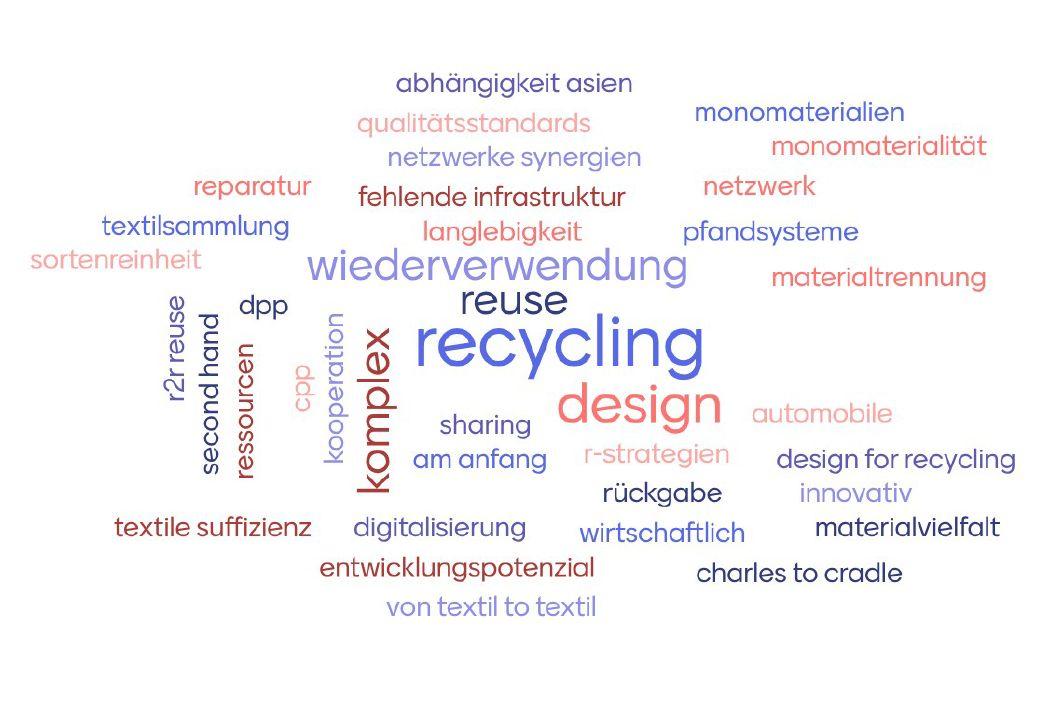 In der Diskussion wurde deutlich, dass die Projekte viel voneinander lernen können und wie wertvoll der Austausch untereinander ist, obwohl die Projekte von sehr unterschiedlicher Natur sind. Einige arbeiten mit Bekleidungstextilien, andere mit Arbeitsbekleidung, textiler Wäsche oder technischen Textilien, wie etwa Kunstrasen. Es gibt auch verschiedene Umsetzungsbarrieren für die Ziele der Projekte, wie etwa die Recyclingkapazitäten in Deutschland oder Abfallströme, die anders als erwartet ausfallen.